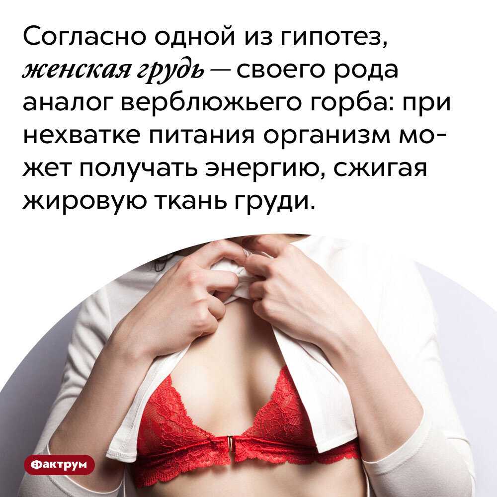 Если этой прекрасной части женского тела отведена чисто функциональная роль, то почему же их обладательницы круглый год выставляют их на показ? По одной из теорий груди женщины развились как средство, чтоб сманить мужчину с дерева. В то время когда нашим предкам только предстояло освоить позу лицом к партнеру, большим спросом пользовались большие круглые ягодицы. Еще одна теория утверждает, что груди развились когда человек стал прямоходящим. Две выпуклости на задней стороне тела женщины дополнились двумя округлостями на ее груди.