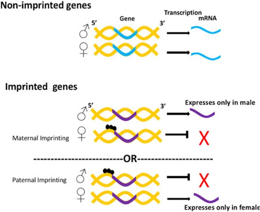 Хотя плод действительно содержит половину ДНК от матери и половину ДНК от отца, за счет феномена геномного импринтинга в хромосоме может быть активна только одна копия гена (либо от матери, либо от отца). Другая копия не будет отвечать за формирование белков, и будет просто молчать. Даже гены и мутации, которые в норме являются рецессивными, могут проявляться в ребенке, если ген импринтируется, а доминантный аллель подавляется.
