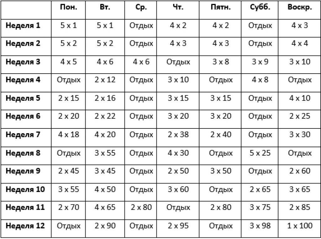 Еженедельная программа 100-дневный воркаут включает:
