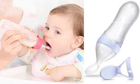 Начать кормить ложкой маленького ребёнка всегда непросто, для полноценного введения дополнительного питания нужно много терпения. Малыш может отказываться есть с ложечки, потому что сосательные движения для него более привычны. Приучить к форме столовых приборов поможет бутылка с насадкой – ложкой. Она есть почти у всех производителей детской посуды, хорошие отзывы родителей говорят об удобстве такой бутылки. Лучшие по применению и качеству будут бутылочки от Pigeon и Philips Avent.