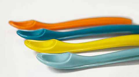 Хорошо зарекомендовали себя термочувствительные ложки фирмы Авент. Они могут менять цвет, например, с красного на жёлтый. Это своеобразное предупреждение, что еда ещё слишком горячая для малыша. Если купить такую ложку, она очень пригодится при разогревании пищи в микроволновке. По цвету легко понять достаточно ли согрелась пища, не обожжёт ли она ротик малышу.
