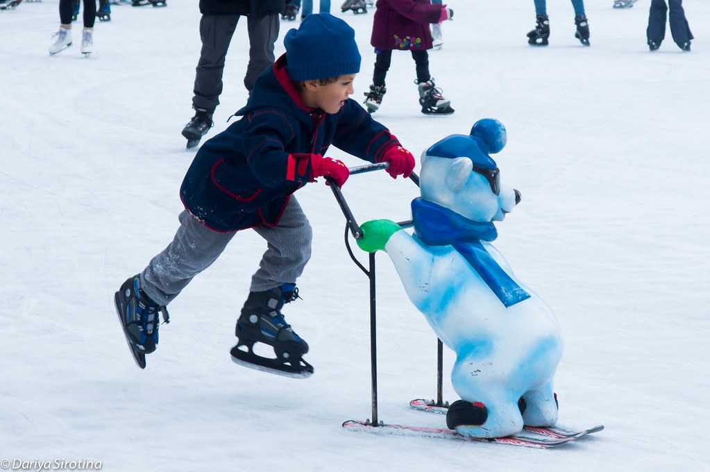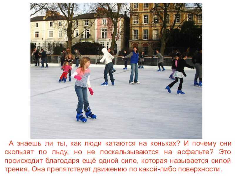 - единственно правильно осваивать коньки именно на льду. То есть плотно утоптанные снежные дорожки, тротуары или даже идеально ровная поверхность проезжей части не приемлемы. Наверное, понятно почему. Все-таки снег и лед не идентичны, а на тротуаре вам непременно будут встречаться неровности – кочки, рытвины. Что же касается опасности проезжей части, то тут и говорить нечего;