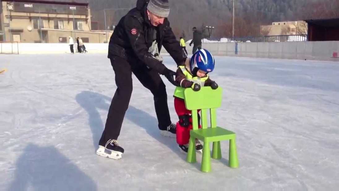 Затем попробуйте легонько подталкивать его, чтобы он катился на двух параллельно стоящих на льду ногах. Затем пусть он сам разбегается по снегу, запрыгивает на лед и катится уже без вашей помощи. Понемногу усложняйте упражнения, вводя повороты. Умение делать крутой поворот коньками в сторону – это уже умение тормозить, а такой навык, согласитесь, не менее важен, чем само умение ездить.