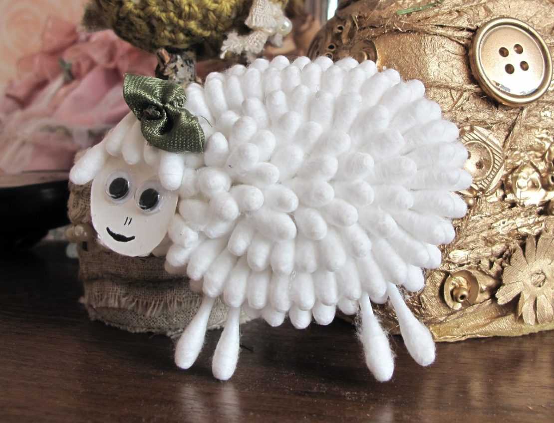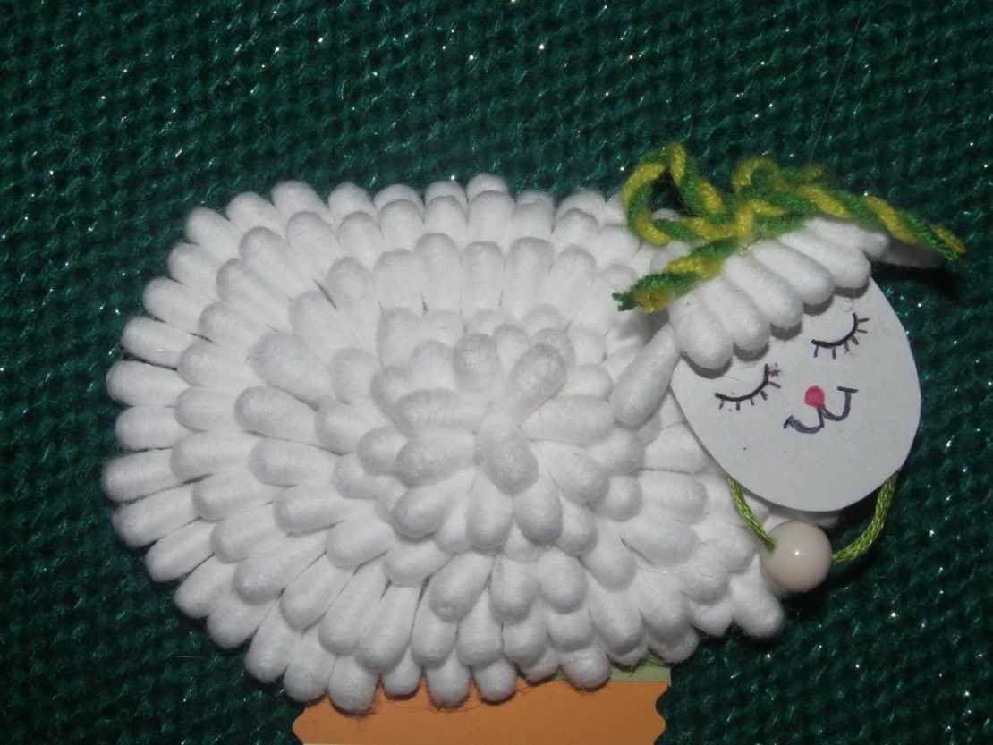 В первую очередь нужно вырезать два овала. Один поменьше, второй больше. Это будут голова и туловище. Дальше обрезаются палочки таким образом, чтобы остались только ватные головки на небольшой ножке. Количество их зависит от основания. Если овечка будет крупная, то и палочек потребуется больше.