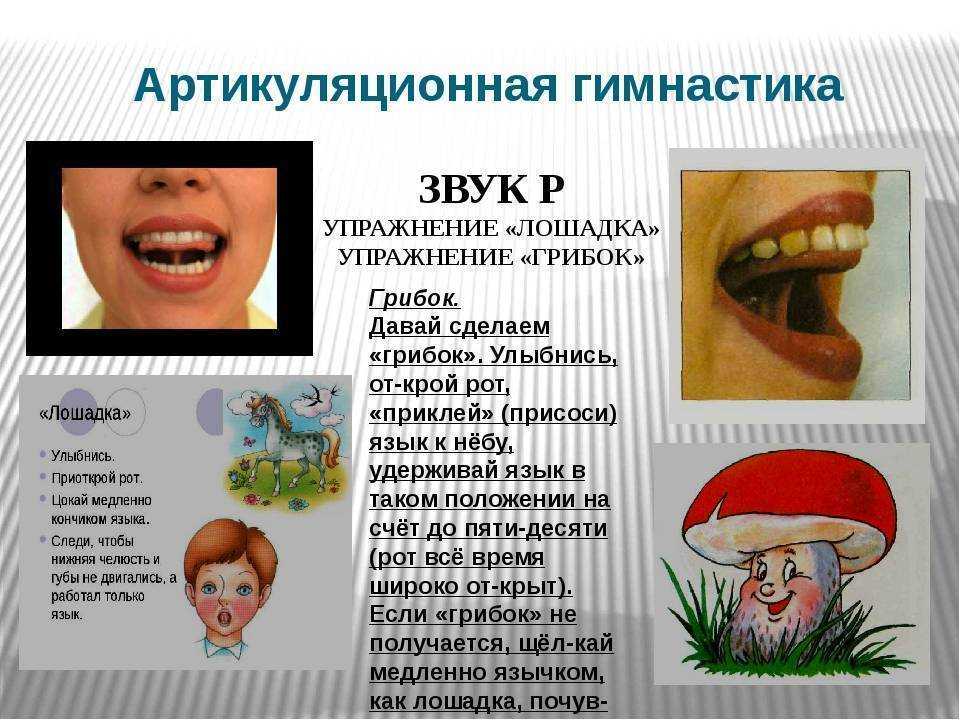 Артикуляционные аппарат находится в тонусе или полностью расслаблен. Губы, щёки и язык напряжены или недостаточно подвижны. И то, и другое мешает ребёнку научиться правильно выговаривать букву «р». Тогда логопед предлагает артикуляционные упражнения.