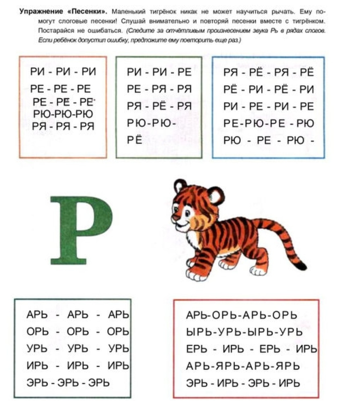 Важно, чтобы ребенок не только рычал как тигр, но и проговаривал «р» и «рь» в словах, независимо от их местоположения и сочетания с другими звуками