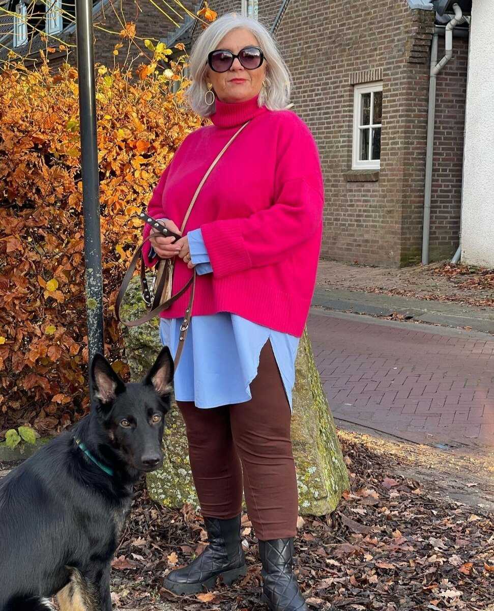 Вот так Йоланда выходит на прогулку с собакой. Длинная блузка, яркий свитер, леггинсы, сапоги на толстой подошве, удобные и легкие, несмотря на внешнюю массивность.