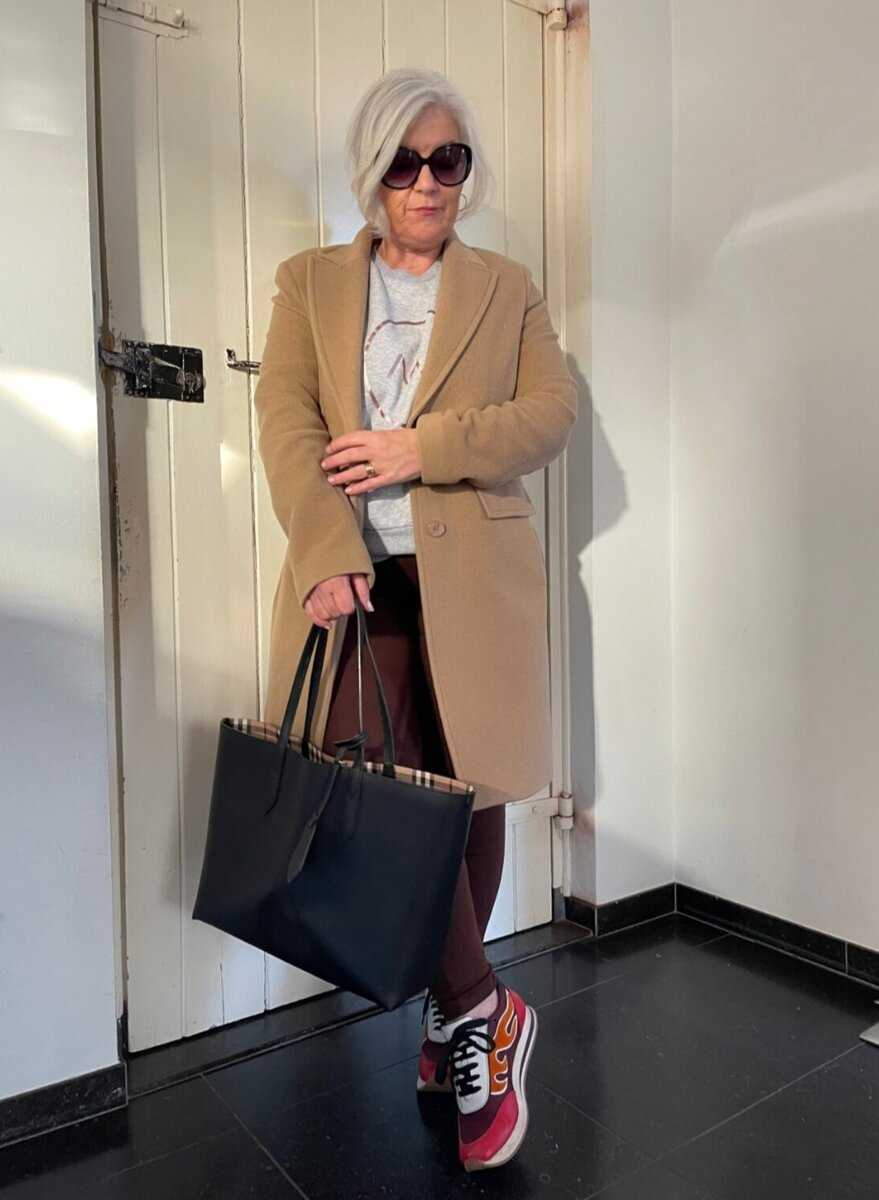 Кроссовки, толстовка с леггинсами, пальто цвета кэмел. Образ повседневный, Йоланда как раз идет с йоги за покупками. Но в таком виде ее никак не назовешь тетушкой с рынка, согласны?