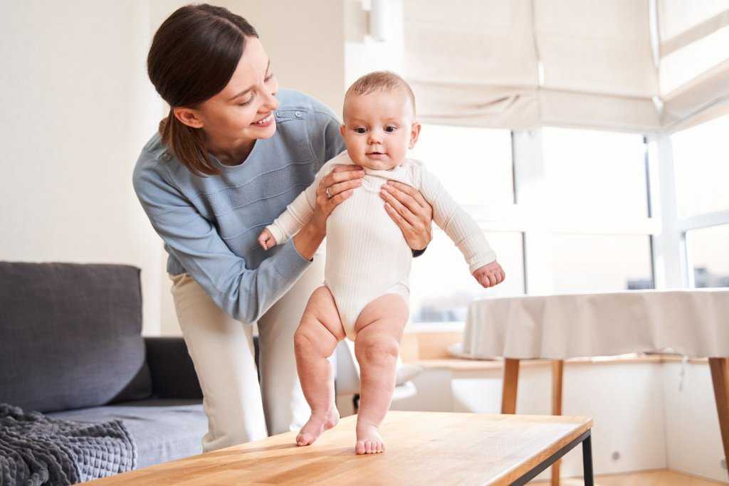 С 9 месяцев важно учить ребенка стоять. Поверхность, от которой малыш будет отталкиваться ножками, должна быть твердой