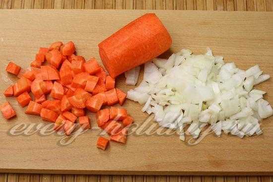 3. После того, как выпарится влага, добавляем порезанные овощи. Сначала лук, а затем морковку. Зажариваем до золотистого цвета.