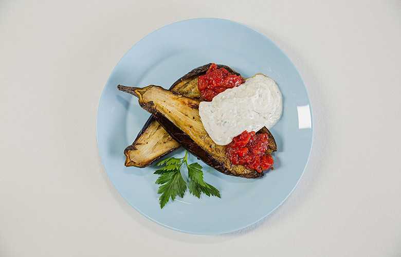 На баклажанах делаем небольшие надрезы заворачиваем в фольгу и ставим запекать в духовку на 30 минут при температуре 180 градусов. Готовые баклажан разрезаем вдоль пополам. Солим, перчим и обжариваем на растительном масле. Подаем баклажан с томатным джемом и чесночной сметаной.
