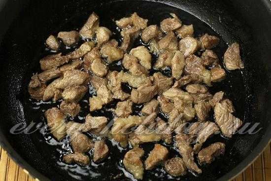 Как только в сковороде останутся жир и мясо, огонь уменьшаем до среднего, обжариваем мясо до появления румяной корочки. Вливаем полстакана воды, прикрываем крышкой и тушим на слабом огне 20 минут. Мясо должно стать мягким.