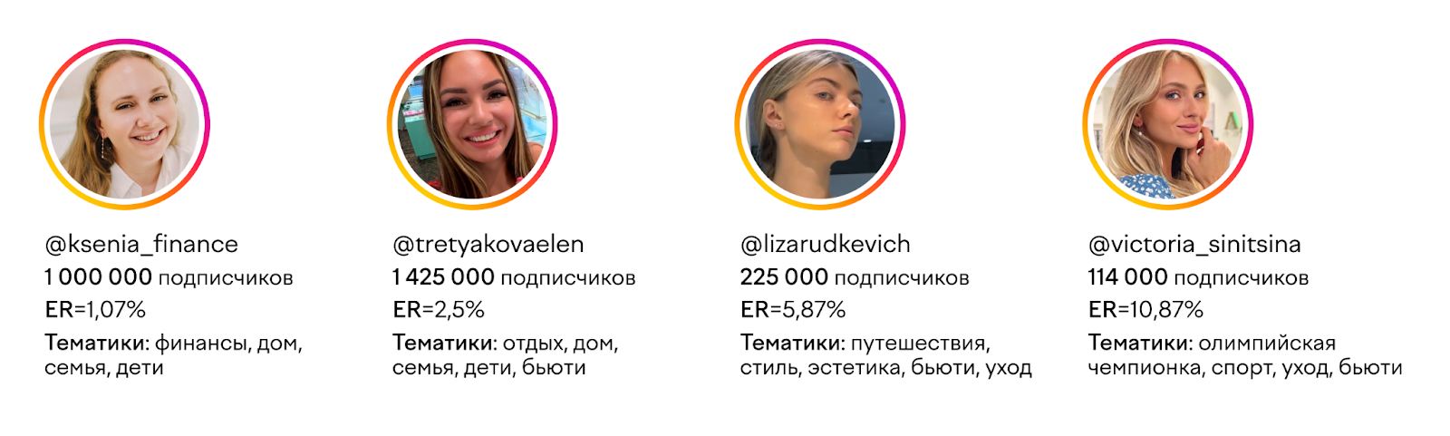 Перед тем, как утвердить блогеров с клиентом, мы анализировали статистику их аккаунтов по вовлеченности, активности подписчиков в LiveDune и trendHERO. В шорт-лист интересных нам блогеров вошли Ксения Падерина, Елена Третьякова, Елизавета Рудкевич и Виктория Синицина.