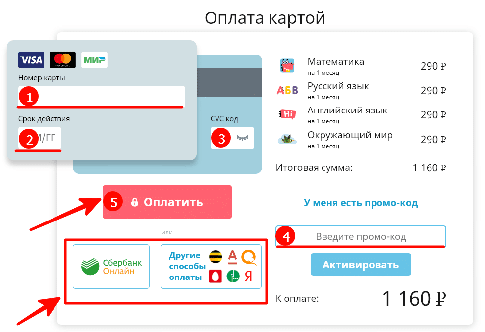 Система автоматически перенаправляет на страницу оплаты с помощью банковской карты. А также можно выбрать другие удобные способы:
