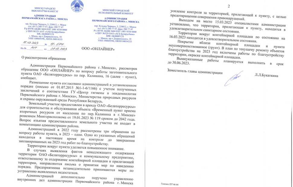 Исполком Первомайского района тоже в курсе ситуации. Так, в администрации отмечают, что в 2022 году поступало три обращения по поводу работы заготовительного пункта, а в недавно начавшемся 2023-м — одно. «Администрацией дополнительно поручено управлению внутренних дел усиление контроля за территорией, прилегающей к пункту, с целью предотвращения совершения правонарушений». 15 марта сотрудники администрации побывали на месте и установили, что территория находится в удовлетворительном состоянии. В план по текущему ремонту на 2023 год включены работы по благоустройству территории (грунтового покрытия) и окраске контейнерной площадки. Справиться должны до конца июня.