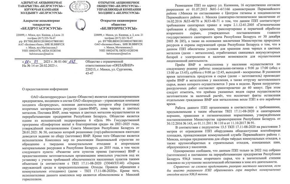 Организация «Белвторресурсы», которой и принадлежит заготовительный пункт в переулке Калинина, 16 и к которой мы обратились за комментарием, в свою очередь, пояснила, что ничего не нарушает: место размещения площадки согласовано, соответствует всем нормам, работает пункт по графику и делает важное дело (с этим никто не спорит). — Данным ПЗП только за 2022 год собрано и поставлено на перерабатывающие предприятия 936,8 тонны вторичного сырья, что в значительной степени повлияло на улучшение экологической обстановки в зоне его деятельности