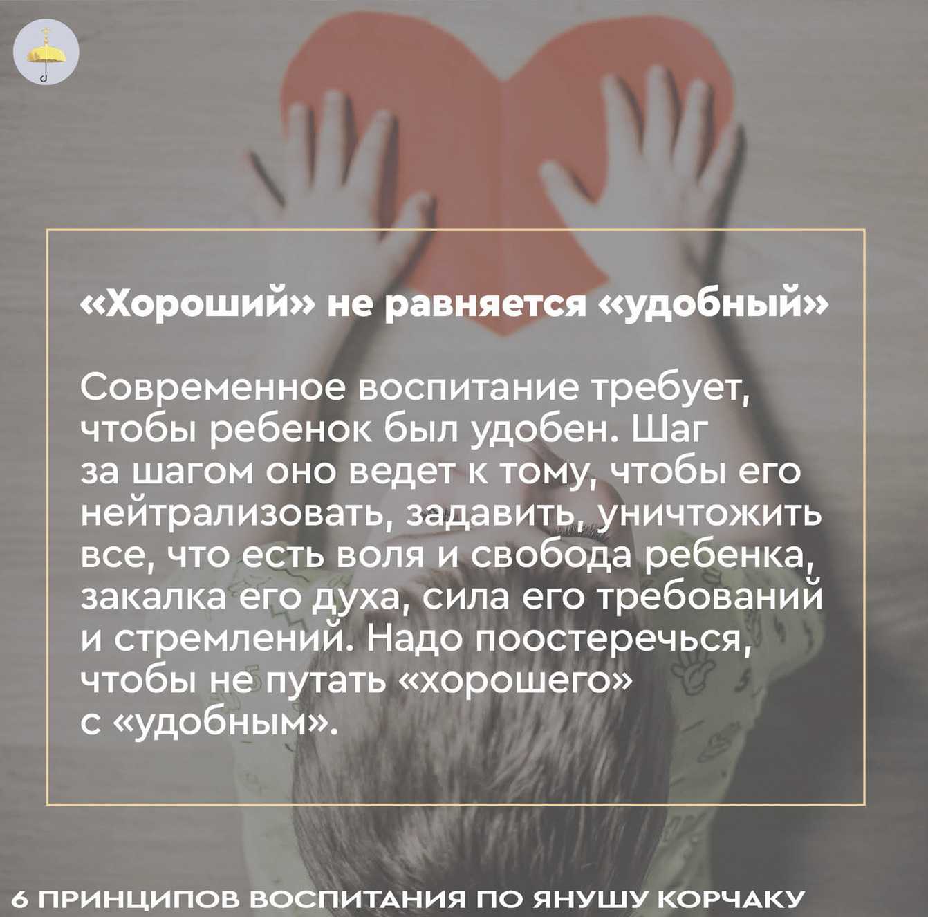 Согласно Янушу Корчаку, позиция взрослого в воспитании должна быть основана на постоянном уважении и любви к ребенку, а не на строгих и бескомпромиссных правилах и требованиях. Взрослый должен воспринимать ребенка как равного себе человека, уметь слышать его и уважительно относиться к его мнению и желаниям.