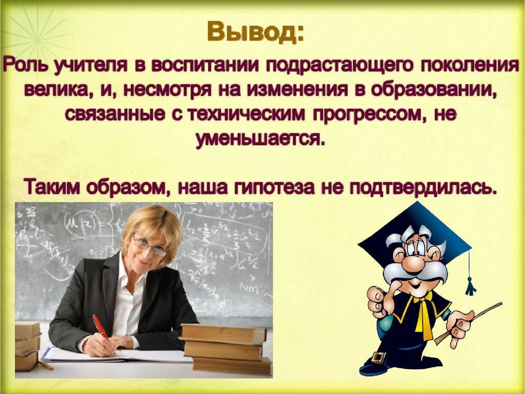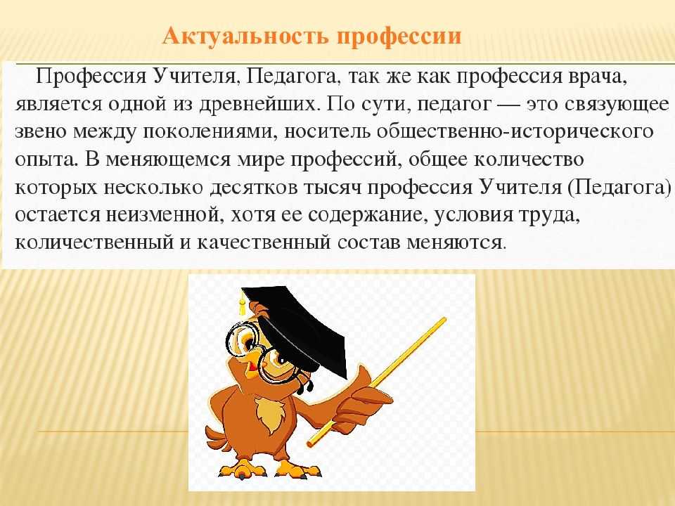 - Влияние конкретного учителя может иметь весомое значение при выборе профессии. Подруга моей мамы, будучи ученицей старших классов, очень любила уроки русского языка и литературы. Её учитель проводила эти занятия настолько увлекательно и интересно, что появлялось желание узнавать новый материал самостоятельно. Изучение именно этих предметов приносило ей сплошное удовольствие, тетради были оформлены наилучшим образом, все домашние задания выполнялись в срок. Об успеваемости даже не поднимался вопрос, получить плохую оценку по любимому предмету было не просто стыдно, это означало подвести учителя, которого уважаешь. Занимательные уроки привили девочке любовь к русскому языку и литературе на всю жизнь, поэтому при выборе будущей профессии вариантов не возникло, она поступила учиться на филологический факультет. Сейчас эта девочка работает учителем в школе, и старается внести в жизнь своих учеников то же прекрасное чувство, которое поселили в её сердце школьные уроки.