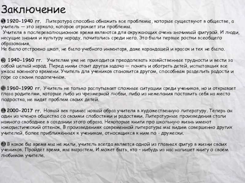 обществе, а учитель — это зеркало, которое отражает эти проблемы. Учителя в послереволюционное время являются для окружающих очень значимый фигурой. И люди, несущие знания и культуру народу, почитались среди него. Это были первые ростки всеобщего образования.Не было отстроено школ, не было учебного инвентаря, даже карандашей и красок и тех не было. ❷ 1940-1960 гг. Учителям уже не приходится преодолевать хозяйственные трудности и вести за собой целый народ. Перед ними стоит другая задача — понять и обогреть детей, испытавших все ужасы военного времени. Учитель для учеников становится другом, способным разделить радости и горе со своим подопечным. ❸ 1960-1990 гг. Учитель не только распутывает сложные ситуации среди учеников, но и открывает глаза родителям, которые либо из чрезмерной любви, либо из нежелания поставить себя на место подростка, не видят проблем своих детей.❹ 2000-2017 гг. Новый век принёс новый образ учителя в художественную литературу. Теперь он один из членов общества со своими слабостями и радостями. Литературные произведения стали намного свободнее в создании этого образа. Некоторые книги про школьную жизнь имеют юмористический оттенок. В произведениях современной литературы мы видим совершенно других учителей, более приближённых к ученикам, относящихся к ним по — дружески. ❺ В какое бы время мы не жили, учитель всегда является одной из главных фигур в жизни своих учеников. Пройдёт время, мы вырастем. И может быть, кто – нибудь из нас напишет книгу о своём любимом учителе.