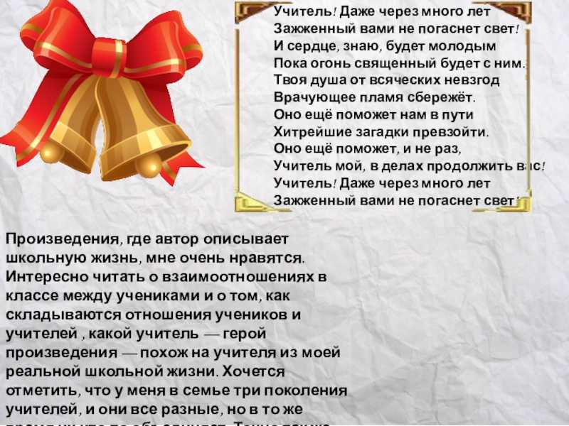 взаимоотношениях в классе между учениками и о том, как складываются отношения учеников и учителей , какой учитель — герой произведения — похож на учителя из моей реальной школьной жизни. Хочется отметить, что у меня в семье три поколения учителей, и они все разные, но в то же время их что-то объединяет. Точно так же, как и героев произведений разных лет.