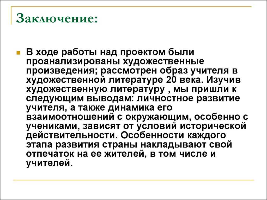 В заключение, образ учителя в русской литературе является одним из самых ярких и значимых. Учителя изображаются как высокие нравственные авторитеты, которые не только передают знания, но и воспитывают своих учеников. Они являются образцом для подражания и вдохновляют на достижение высоких целей. Образ учителя в русской литературе является символом высоких нравственных принципов и идеалов, которые должен следовать каждый учитель.