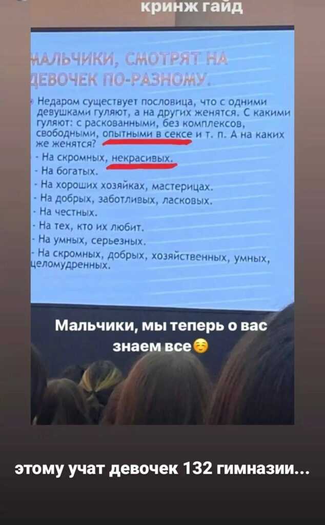 Каждый год в гимназии №132 проходят беседы-лекции с гинекологами, на которые приглашают девочек с 8-го по 11-й классы. Чаще всего девочки собираются в актовом зале, где им представляют гинекологов. Там же обычно находятся психолог и завуч. Лекторы показывают презентацию, рассказывают, что такое менструация, что её не нужно стесняться и так далее.