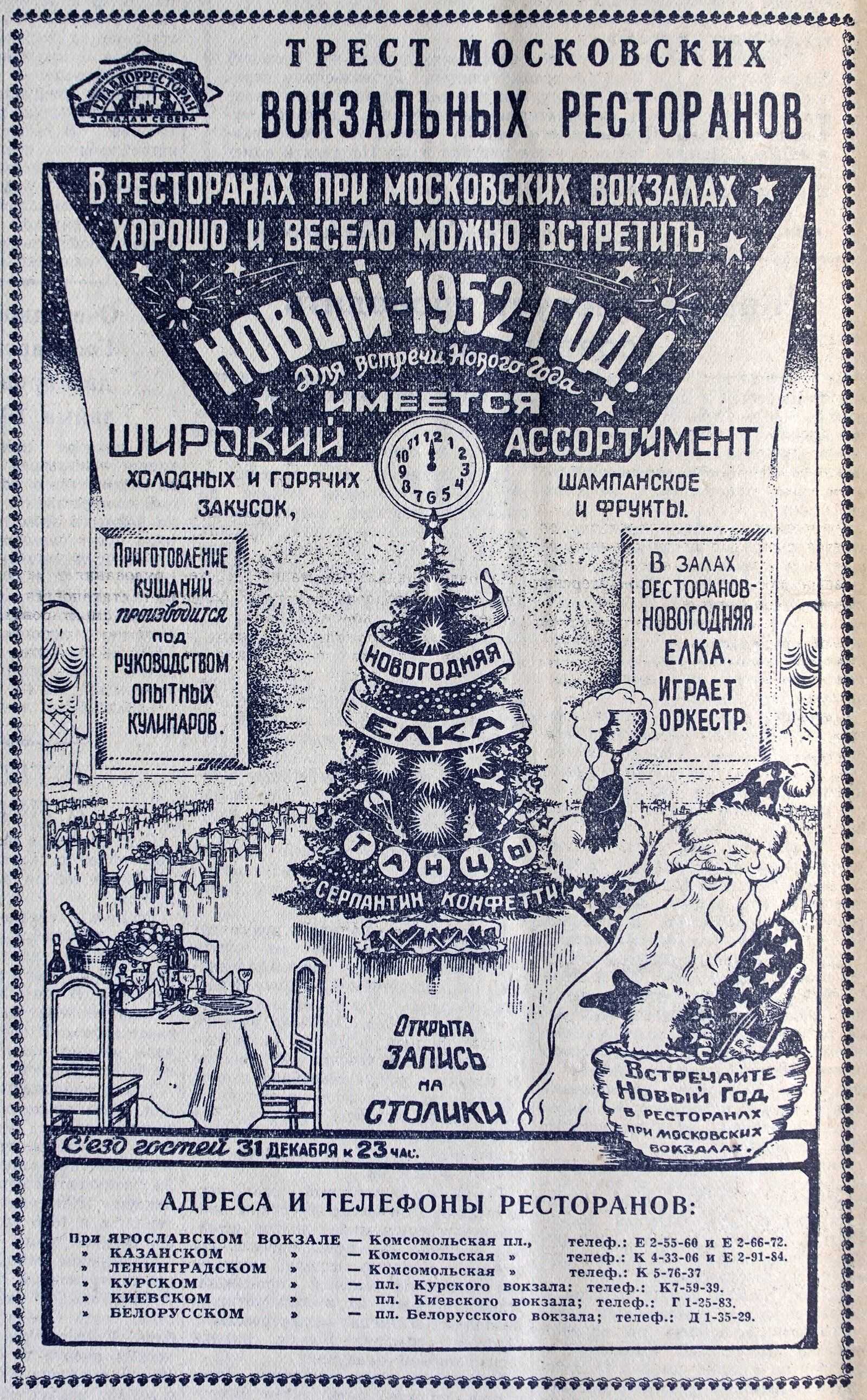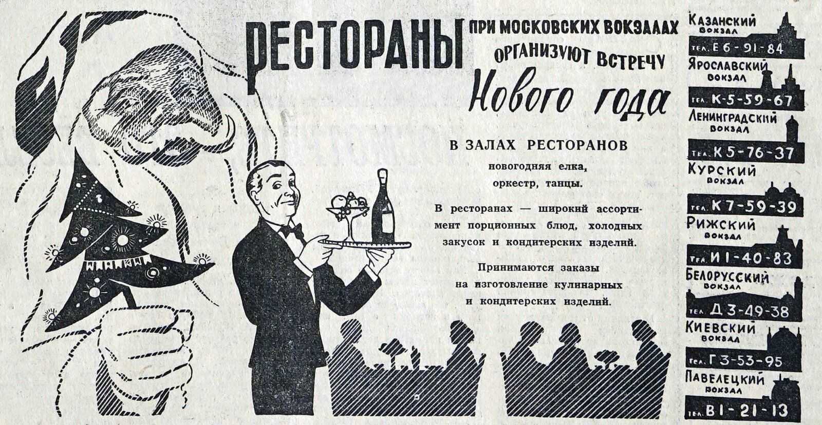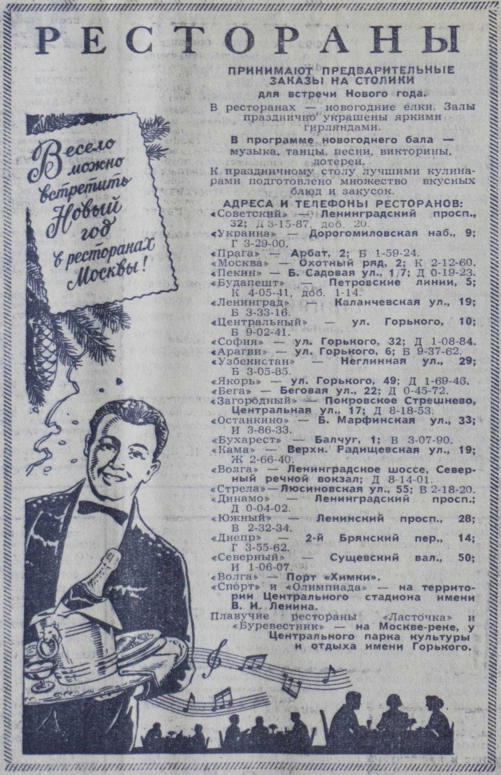 Крупные предприятия общественного питания, тресты ресторанов и столовых также готовились к Новому году. В отличие от заведений общепита при предприятиях, в городские и привокзальные рестораны мог прийти кто угодно. Ограничений не было.
