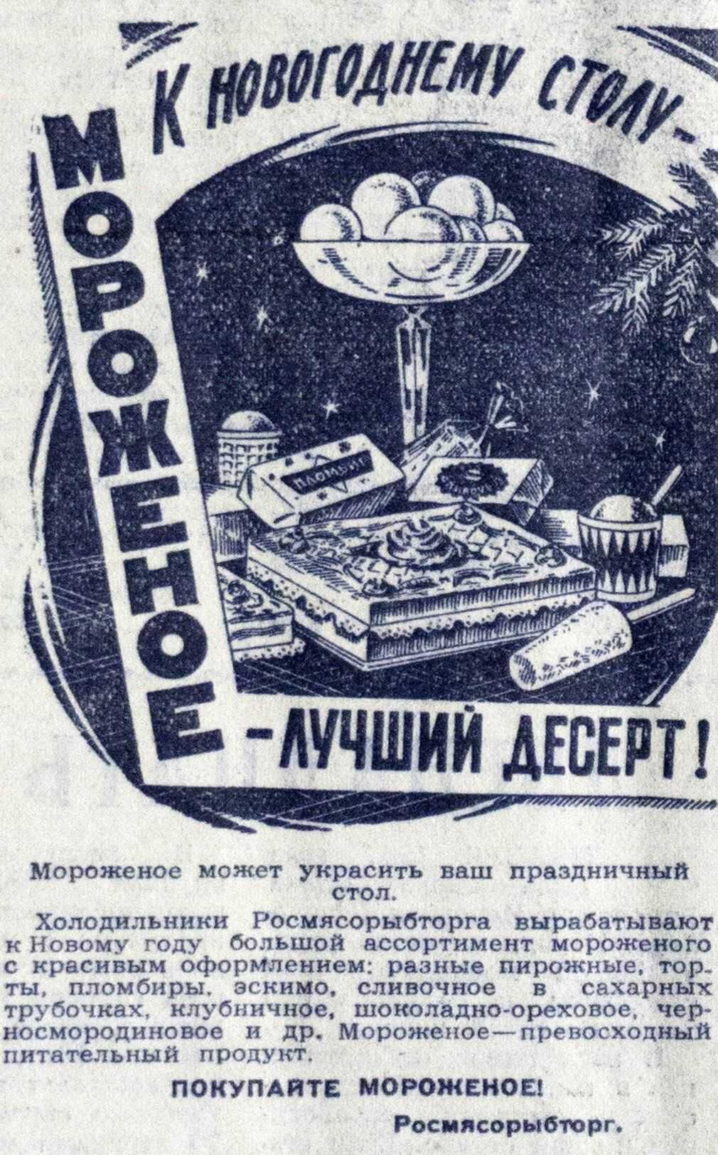 На Новый год москвичи любили есть мороженое. Также на праздничном столе обязательно присутствует шампанское. Производство советского игристого напитка начали налаживать на юге СССР перед войной. После 1945 года в столице начал работу Московский завод шампанских вин, и звон бокалов под бой курантов вскоре стал неизменным атрибутом праздника.
