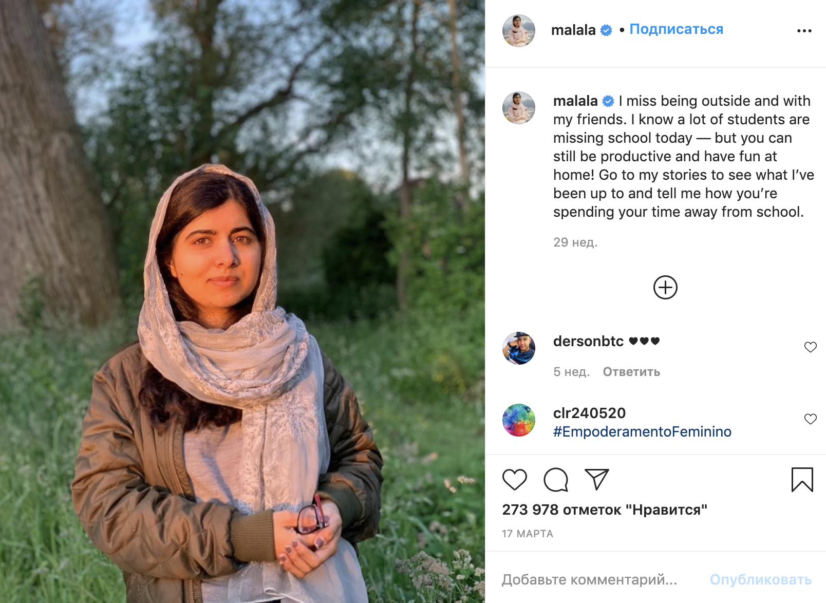 В 17 лет Малала получила Нобелевскую премию мира, став самой юной лауреаткой. Также девушка открыла школу для девочек-беженок в Ливии, а сама поступила в Оксфорд. Сегодня Малала является известной активисткой за право девочек на образование.