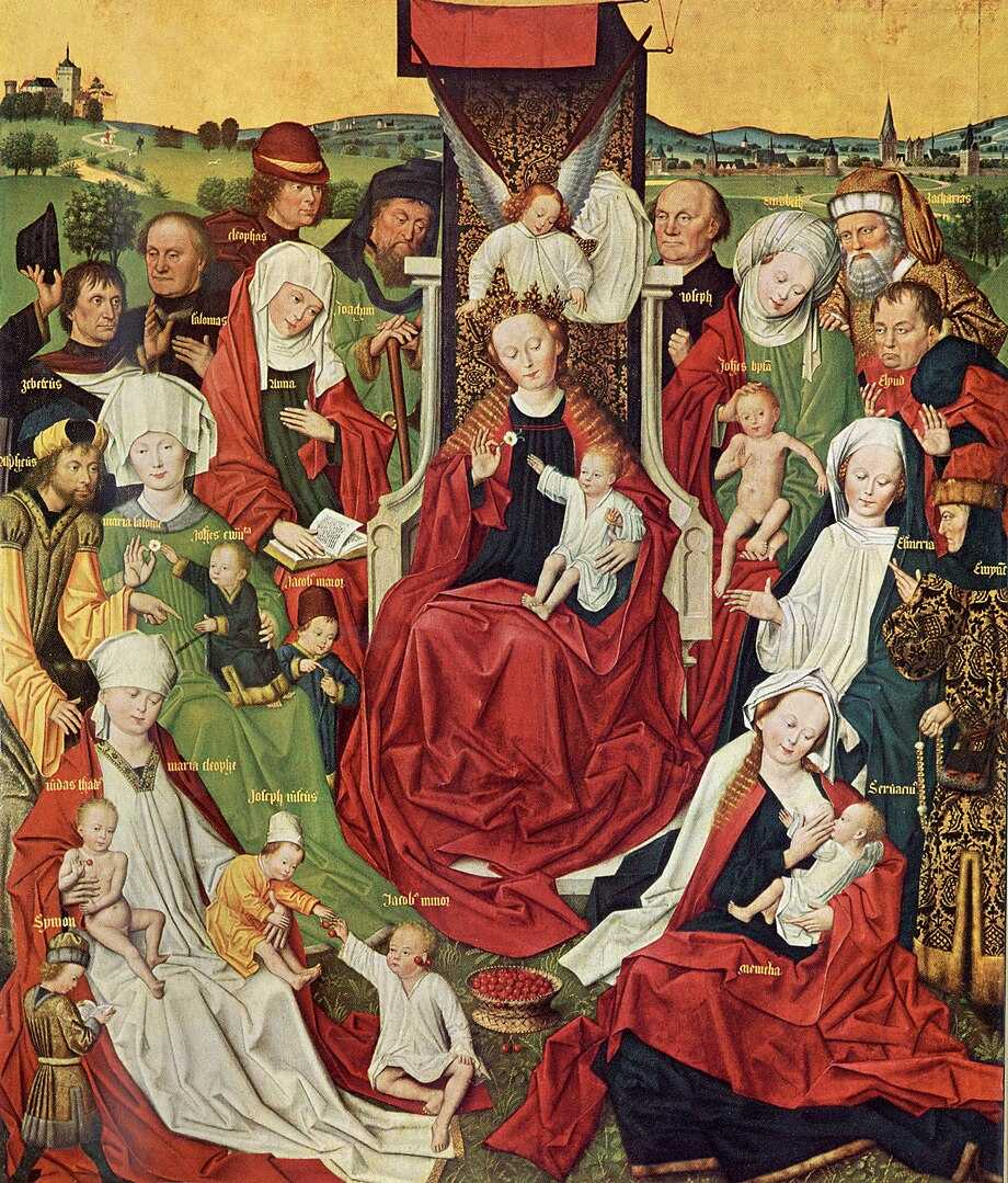 «Святая родня» — изображение семьи святой Анны с её многочисленными внуками. В центре расположена дева Мария, слева от неё Анна с книгой в руках, с тремя своими мужьями позади. Фото: общественное достояние