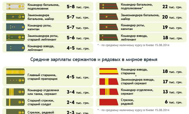 Зарплаты сержантов-инструкторов очень низки. Заработная плата у полковников-начальников отделений в госпиталях, в армии — не менее 20 000 рублей в месяц. У лейтенантов (выпускников ВМедА), в среднем — 10 тысяч.