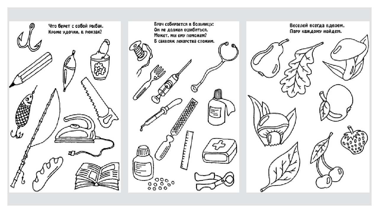 Нарисуйте на листе бумаги десять яблок в ряд, среди которых пусть окажется одна груша. Как быстро ребенок сможет найти и обвести ее? А если спрятать две груши среди двадцати яблок? А если раскрасить все плоды одинаково — легче станет или тяжелее? Попробуйте поиграть так с ромбами, «затерявшимися» среди треугольников, или с корабликами, которые спрятались за машинками. Особенный предмет может быть особенным по форме, по цвету, по любой незначительной детали (наличие плодоножки у яблока, отсутствие колеса у машинки)