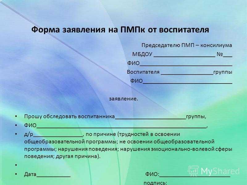 Кроме того, потребуется заполнить заявление о проведении обследования (если инициатива исходит от родителей) или согласие, если на ПМПК направляют образовательная, медицинская организации или МСЭ. Бланк заявления выдают члены комиссии, они же могут помочь его заполнить.