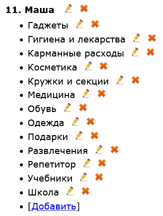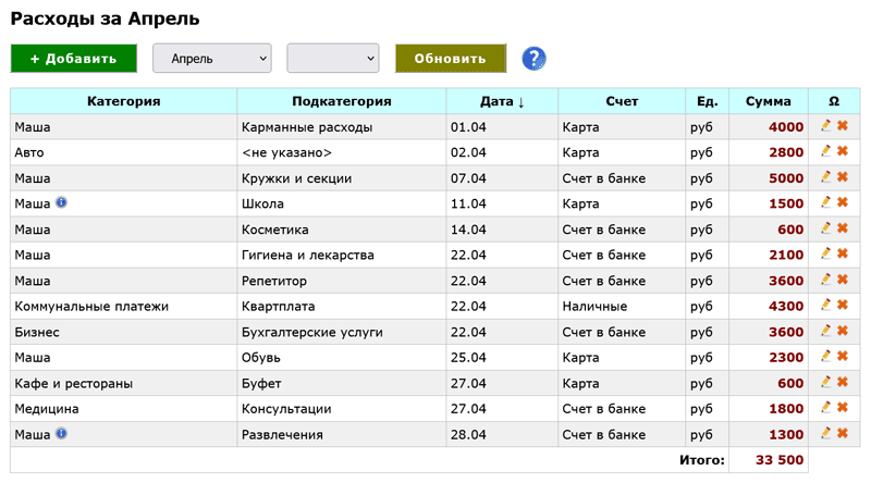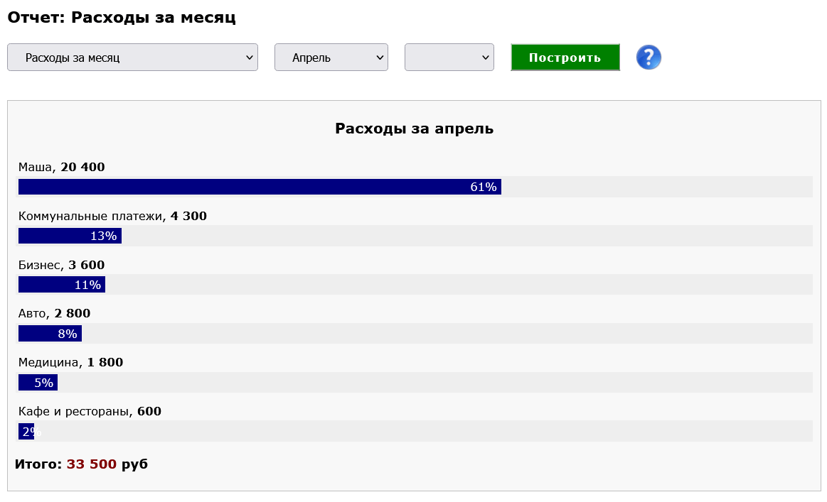 Заполняем нужные поля и сохраняем расход в базе. Аналогично поступаем со всеми расходами на ребенка. Через месяц мы увидим структуру расходов на Машу.