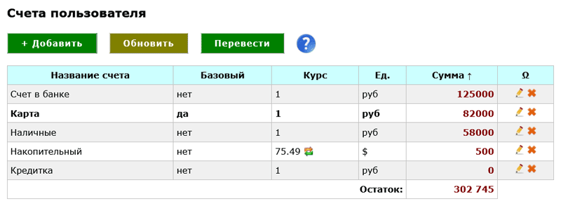 После регистрации необходимо заполнить раздел «Счета». Нужно просто ввести текущие остатки на ваших счетах, а если какой-то счет отсутствует, то следует его добавить.