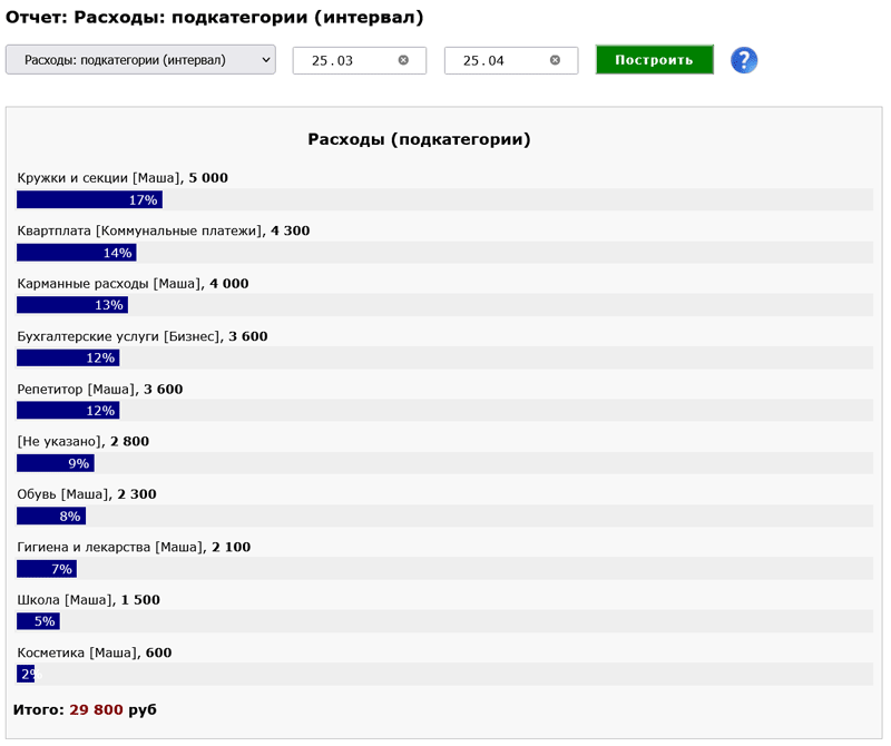Можно детализировать затраты – для этого построим отчет «Расходы: подкатегории». В этом отчете вы сможете увидеть, какие именно расходы (подкатегории) относятся к ребенку.