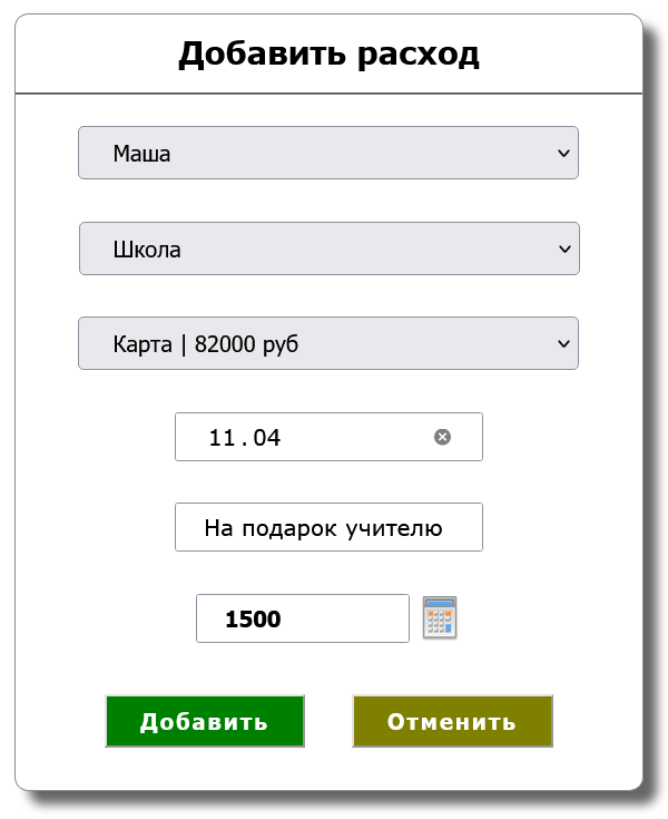 Переходим в раздел расходы и нажимаем кнопку «Добавить», затем выбираем категорию «Маша» и указываем подкатегорию расхода, например, «Школа».