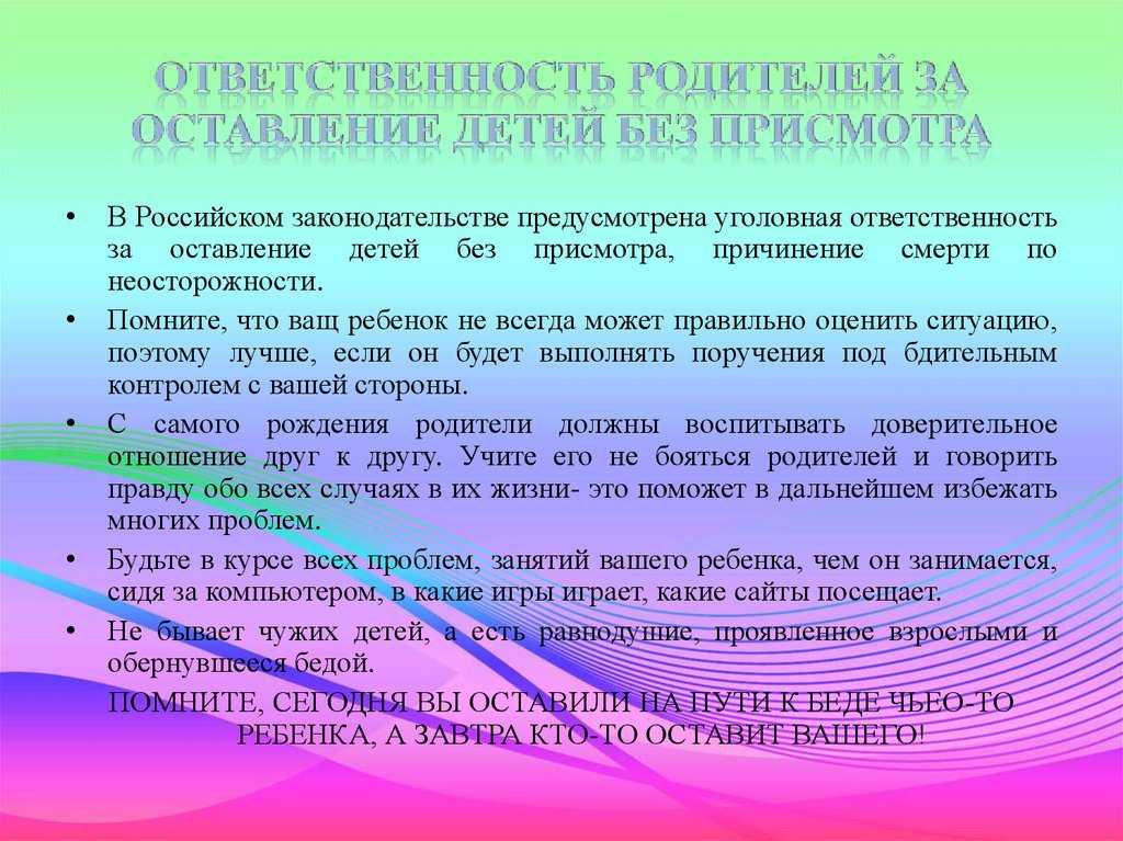 Родители должны быть предельно честны с детьми, максимально искренни. Не нужно проводить рядом с ребёнком все свое время, контролировать каждый его шаг. Это совершенно излишне и приносит только вред: малыш вырастет в пассивного, не имеющего собственного мнения человека. К тому же постоянное общество взрослых может придать неправильное направление духовному развитию несовершеннолетнего.