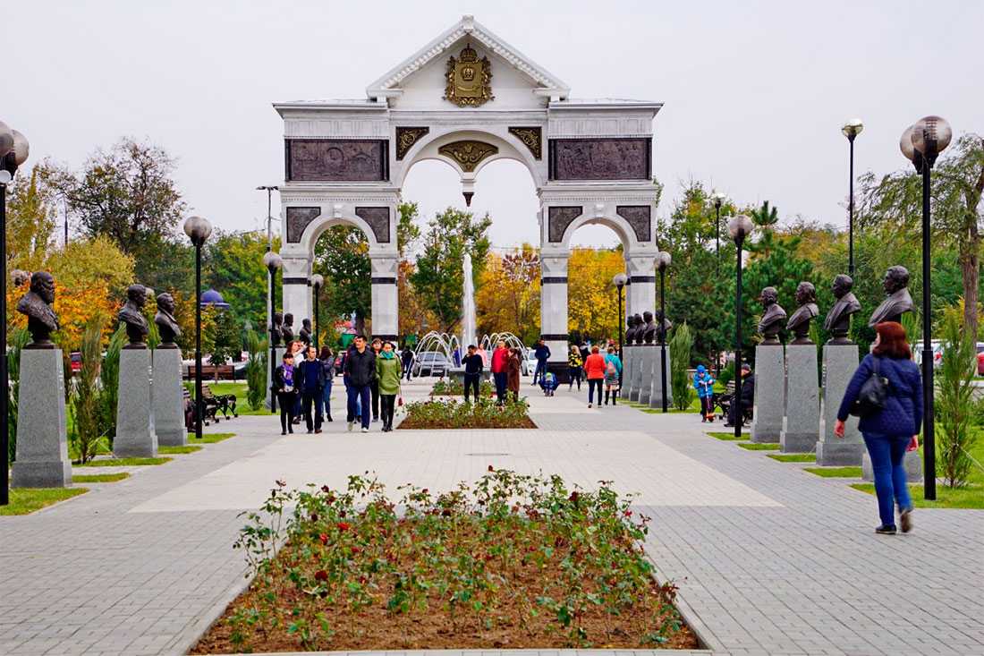 Ещё пять минут пешком — и вы у Триумфальной арки. Первоначально её возвели в середине XIX века к приезду императора Александра II. В советское время арку снесли и построили другую, а в 2017 году её переделали в третий раз. Новая версия — уже из гранита и мрамора, но по чертежам предшественницы.