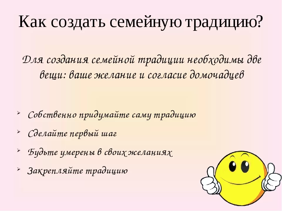 Конечно, мы привели лишь некоторые примеры. Этот список можно продолжать и продолжать. А какие традиции есть в вашей семье? Достаточно ли их? Любимы ли они всеми домочадцами?