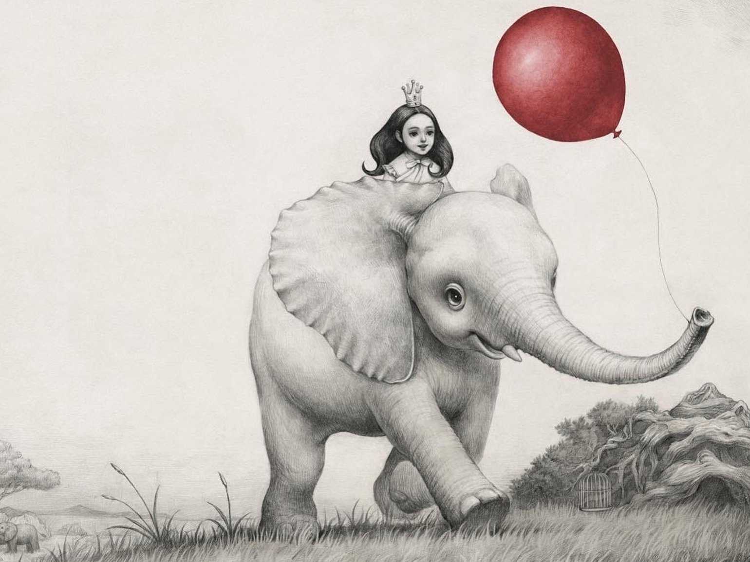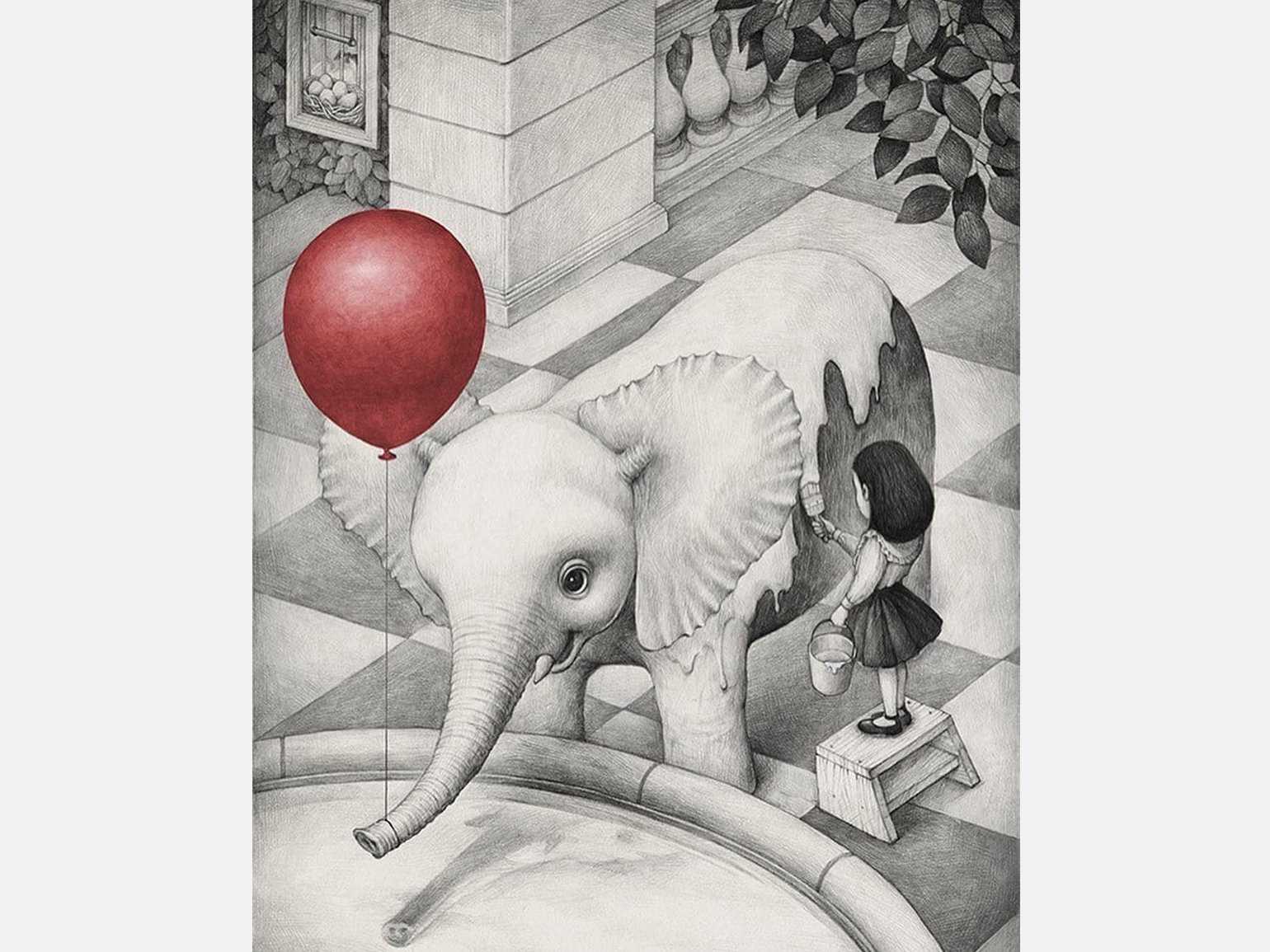 Яркие цвета художница добавляет с осторожностью, они символичны. В «Леа и слон» сперва появляется акцентный алый воздушный шар как метафора мечты