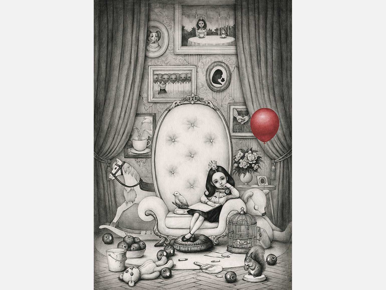 Главная героиня книги Леа похожа на сказочную принцессу ― большеглазая, бледная, утончённая. Пространство иллюстрации насыщено мелкими деталями, которые рассказывают историю героини: вот фото Леа, сидящей за столом с птичкой, а вот клетка ― символ того, что девочка пытается любой ценой удержать рядом близких, чтобы не быть одинокой.