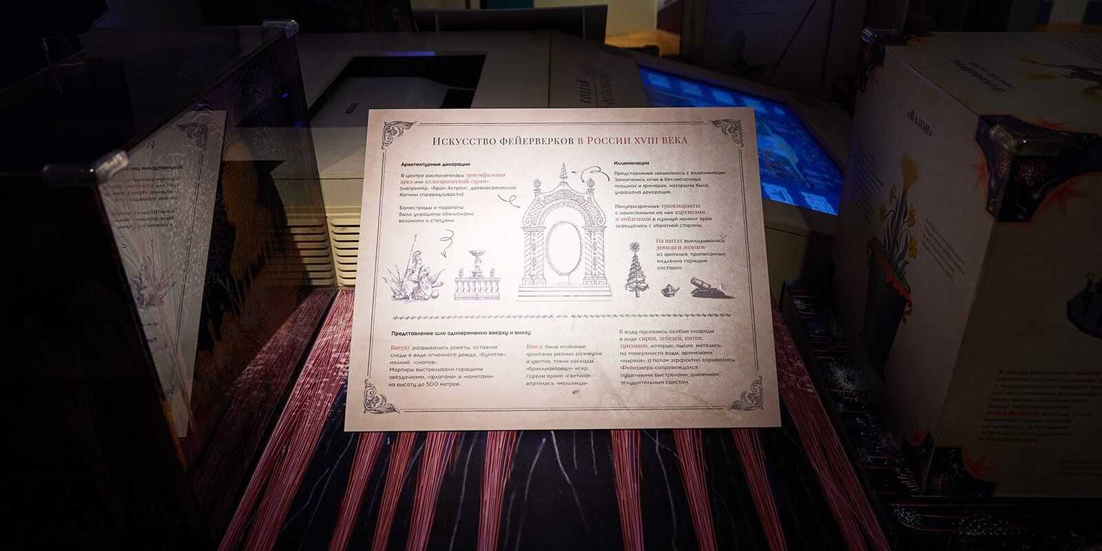 Никакой крупный праздник при дворе Екатерины II не обходился без фейерверка. Узнать, как он выглядел в екатерининские времена, можно в этом же зале. Создать собственный фейерверк помогут современные технологии: сначала дети и взрослые выбирают элементы и пиротехнические фигуры на сенсорном мониторе, а затем любуются своим произведением — фейерверк будет смоделирован на большом экране.