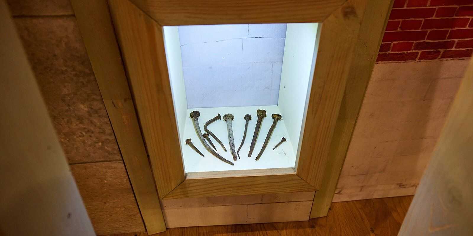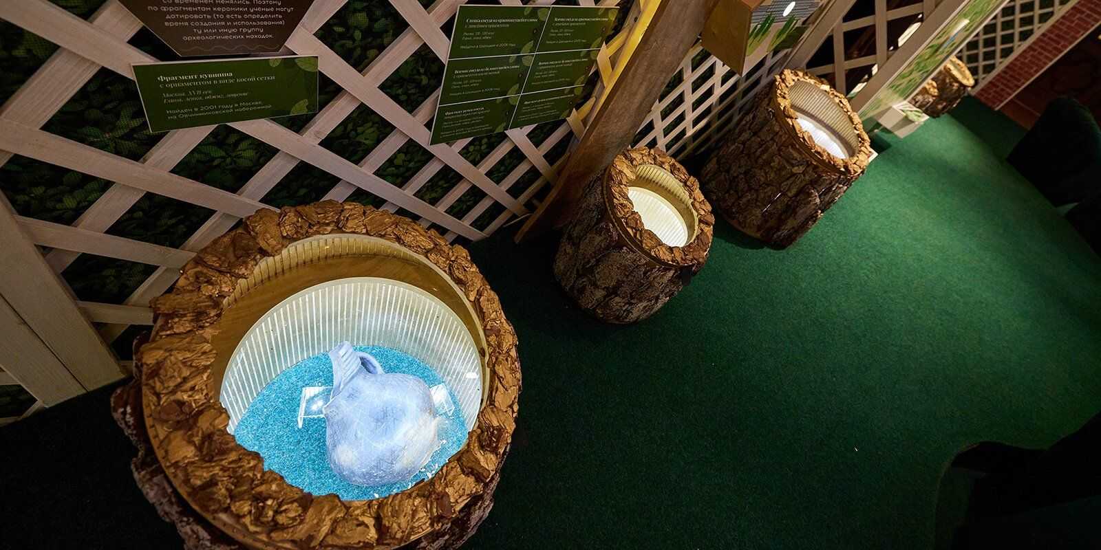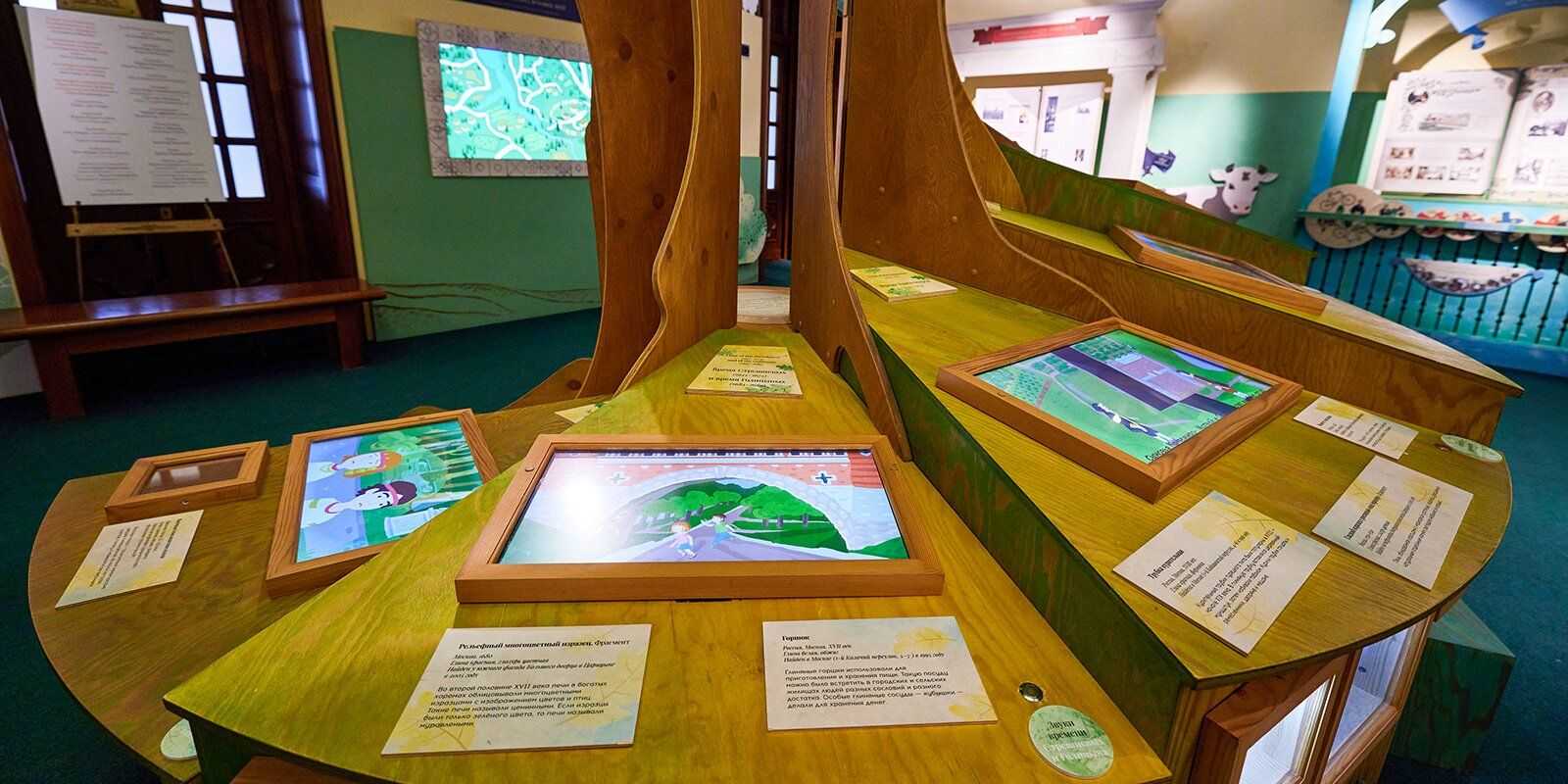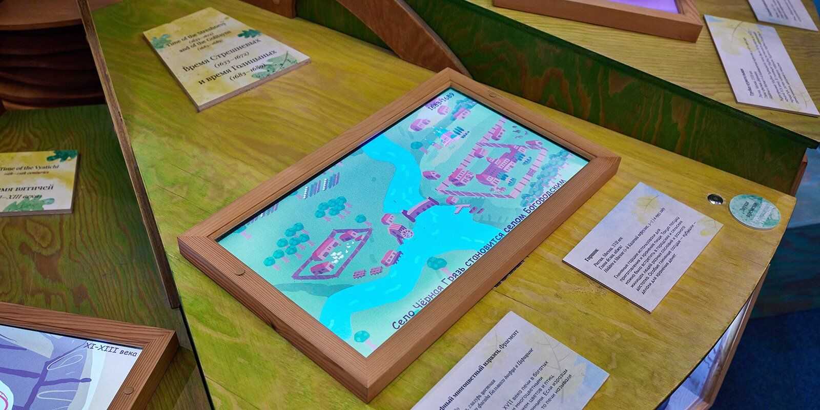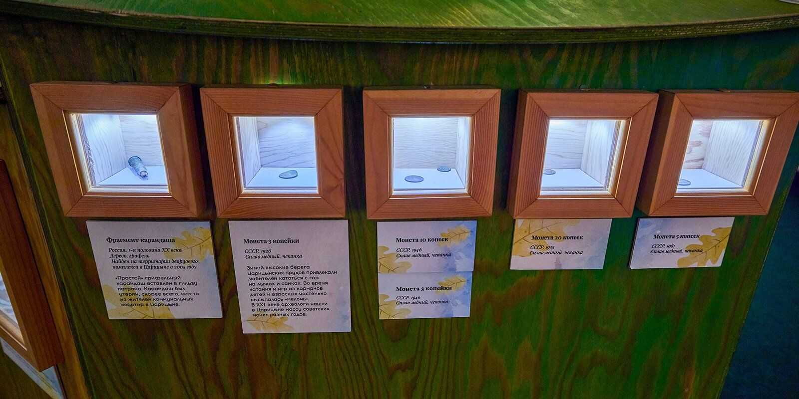 В первом зале, посвященном разным историческим эпохам, гостей встречает инсталляция «Царицынский дуб». У нее, кстати, есть реальный прототип, который можно увидеть в музейном парке: настоящему царицынскому дубу больше 250 лет, его здесь очень любят. Вокруг инсталляции расположены так называемые культурные слои в виде колец дерева. На каждом — небольшие мониторы, на которых можно посмотреть короткие мультфильмы о том или ином историческом периоде — от бронзового века до времен СССР.