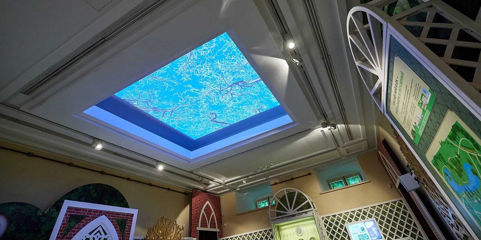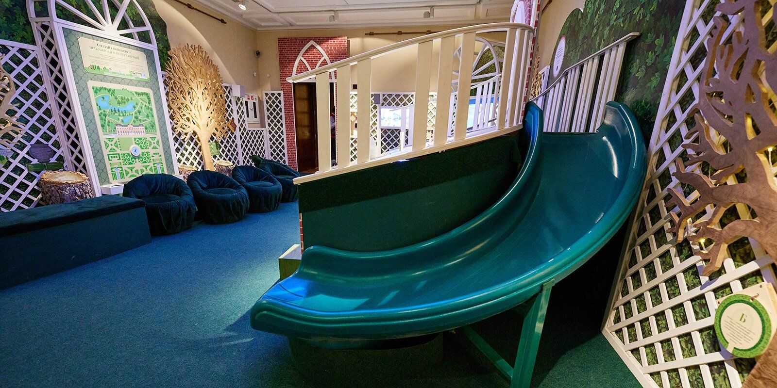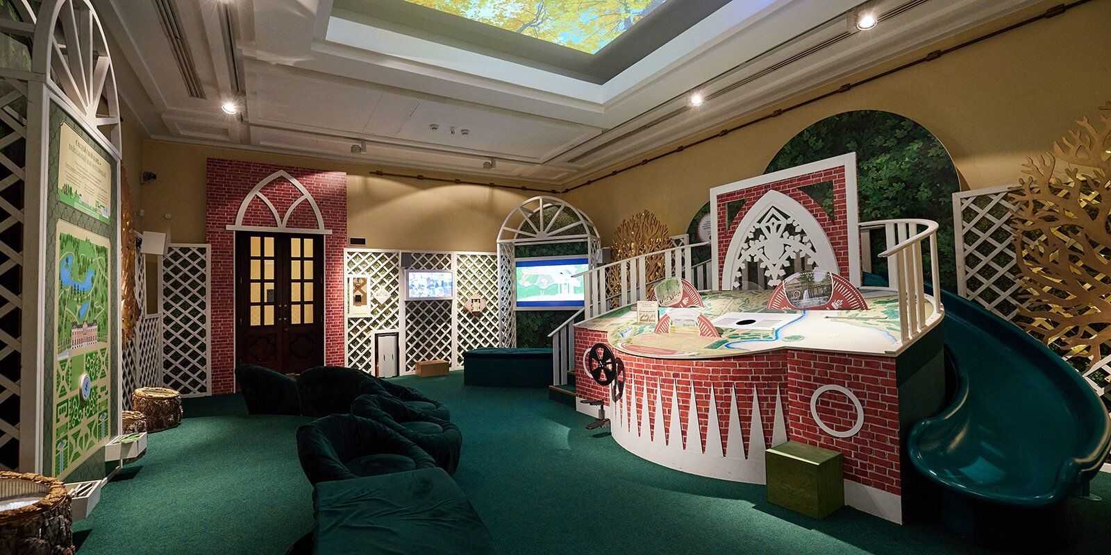 В центре зала — большой экран, на котором показывают мультфильм про парковые павильоны Царицына, построенные в XIX веке. А в зоне отдыха ждут небольшие удобные кресла — если откинуться на спинку и посмотреть вверх, можно полюбоваться видами парка в разные времена года, которые проецируются на потолок. Для тех, кому необходимо выплеснуть энергию, накопившуюся во время познавательной прогулки, здесь есть горка.