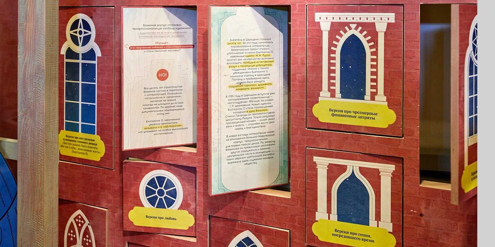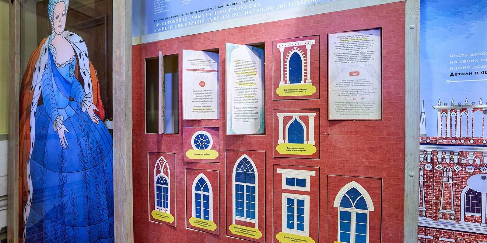 Причина, по которой императрица отстранила от строительства Царицына Баженова, до сих пор остается загадкой и вызывает споры специалистов. Модуль «12 версий, почему Екатерина II остановила строительство» предлагает попробовать себя в роли историков. Он представляет собой дворцовую стену с вращающимися окнами. На внешней стороне каждого указана возможная причина, на внутренней — пояснение о том, могло ли это быть на самом деле. Причины самые разные: от версии про неразделенную любовь до масонского заговора (детям, конечно же, объясняется, кто такие масоны).