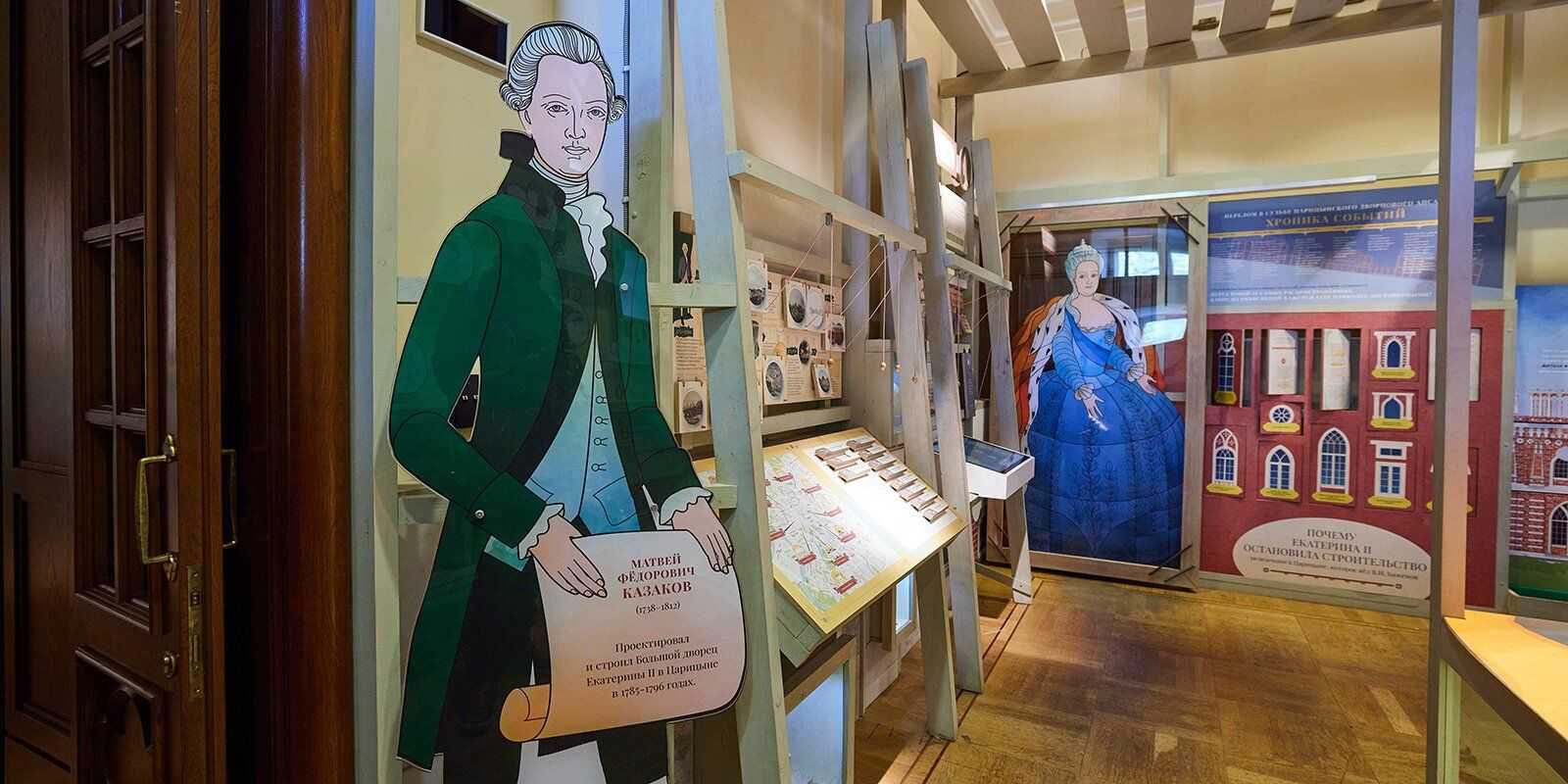 Второй зал посвящен строительству резиденции. Главные герои здесь — архитекторы Василий Баженов, Матвей Казаков и Екатерина II. Изначально императрица доверила строительство Баженову, однако спустя несколько лет — в 1785 году — по какой-то причине отстранила его. Через полгода ученик Баженова Матвей Казаков предоставил правительнице свой проект, который она одобрила. Следующим же летом приступили к строительству.