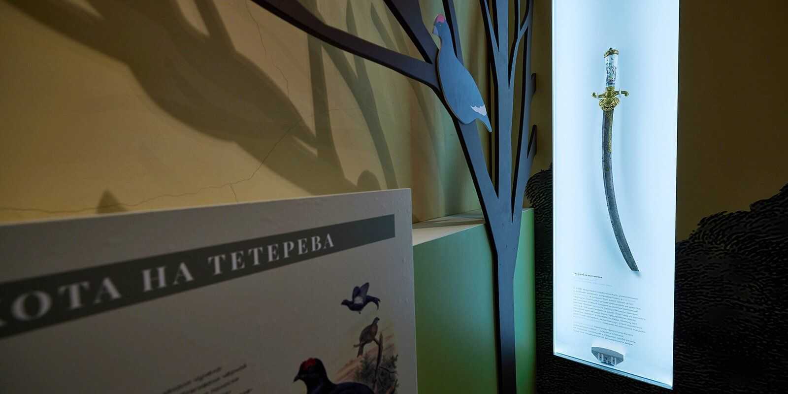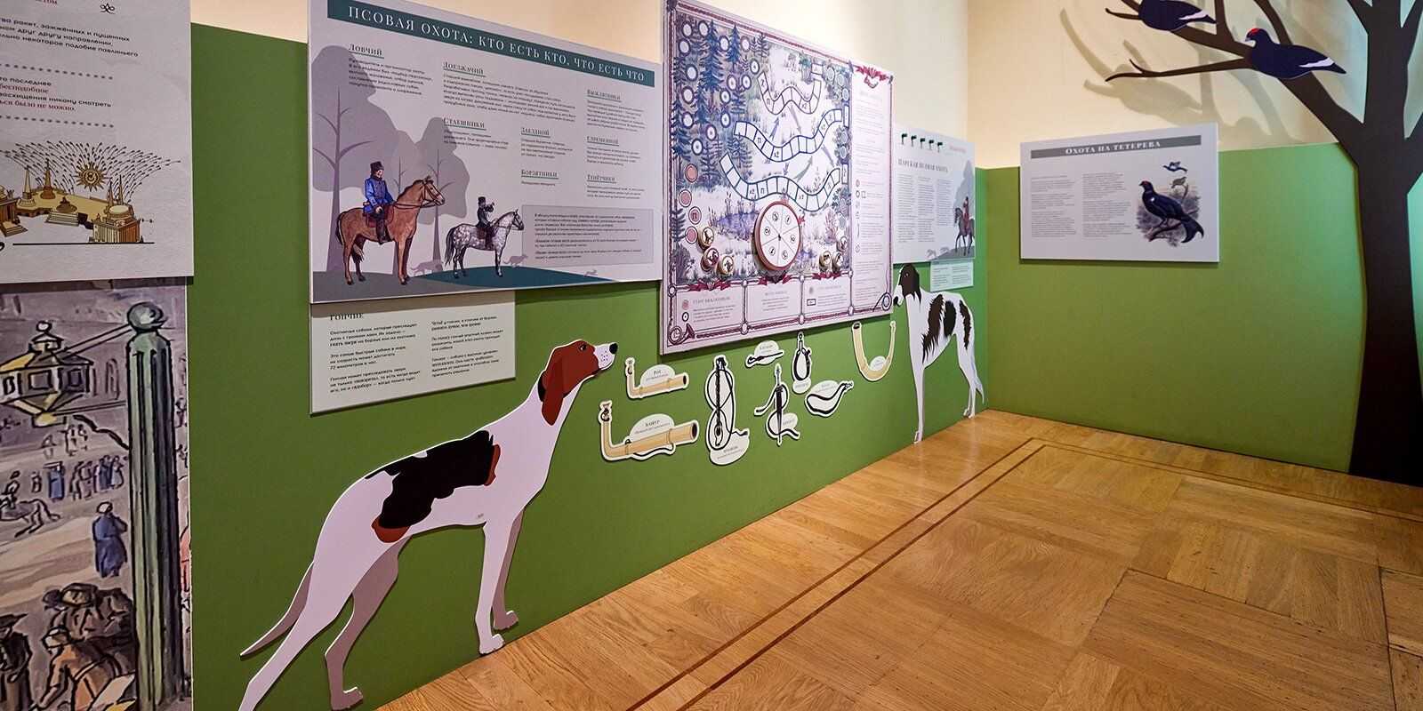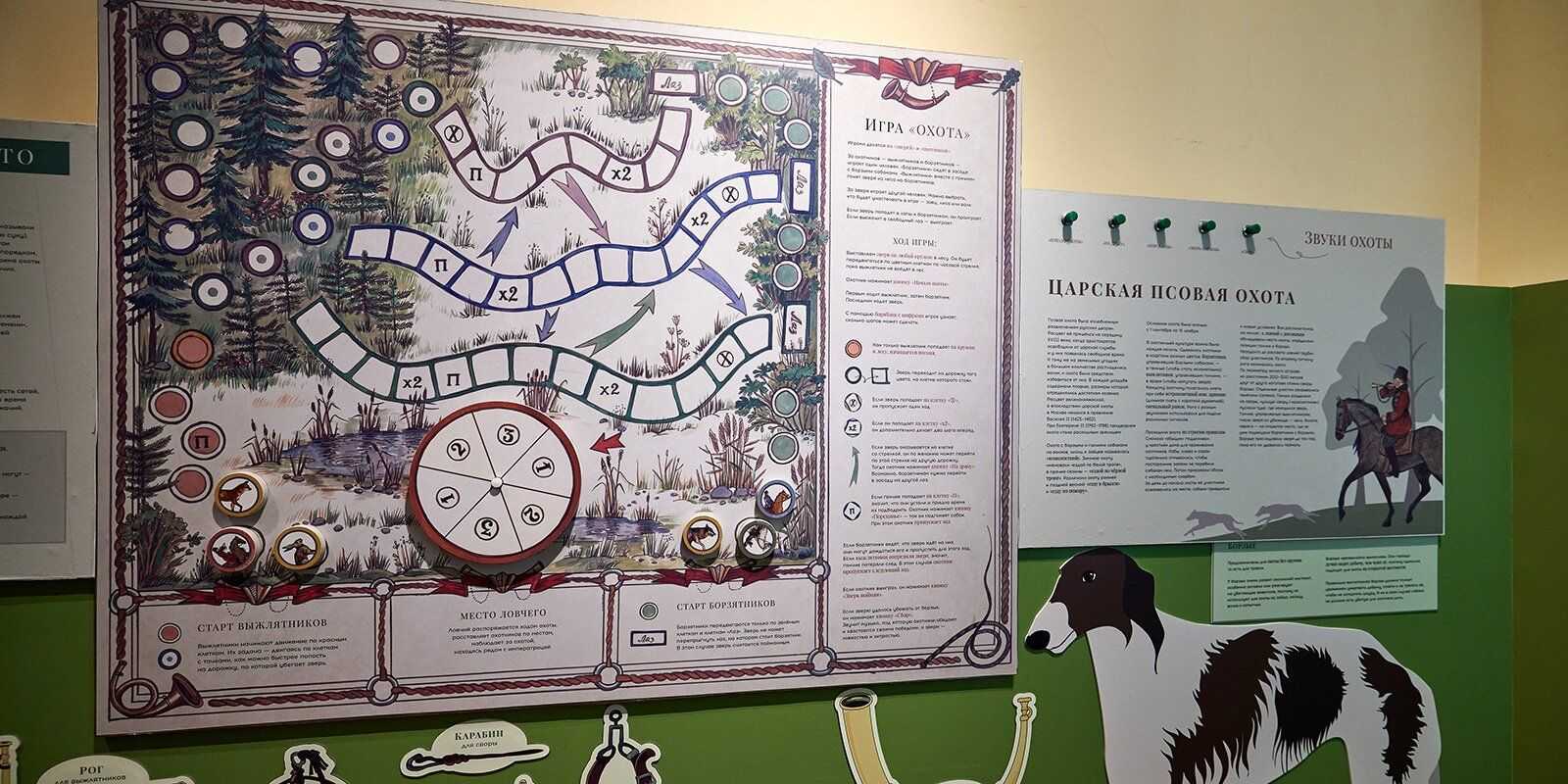 Еще одним популярным развлечением XVIII века была царская псовая охота. Ее правила объясняет игра с магнитными фигурами, вывешенная на стене. Рядом есть справка, из которой станет ясно, например, что выжлятник — это наемный охотник, приставленный к гончим собакам, а борзятник — тот, кто управляет сворой охотничьих собак. Здесь же можно узнать, как «звучала» охота: например, услышать, какой звук издавал рог, сигнализируя о ее начале. Неподалеку от стенда с игрой — охотничья полусабля из фондов музея-заповедника: именно такие были постоянными спутниками свиты императрицы.
