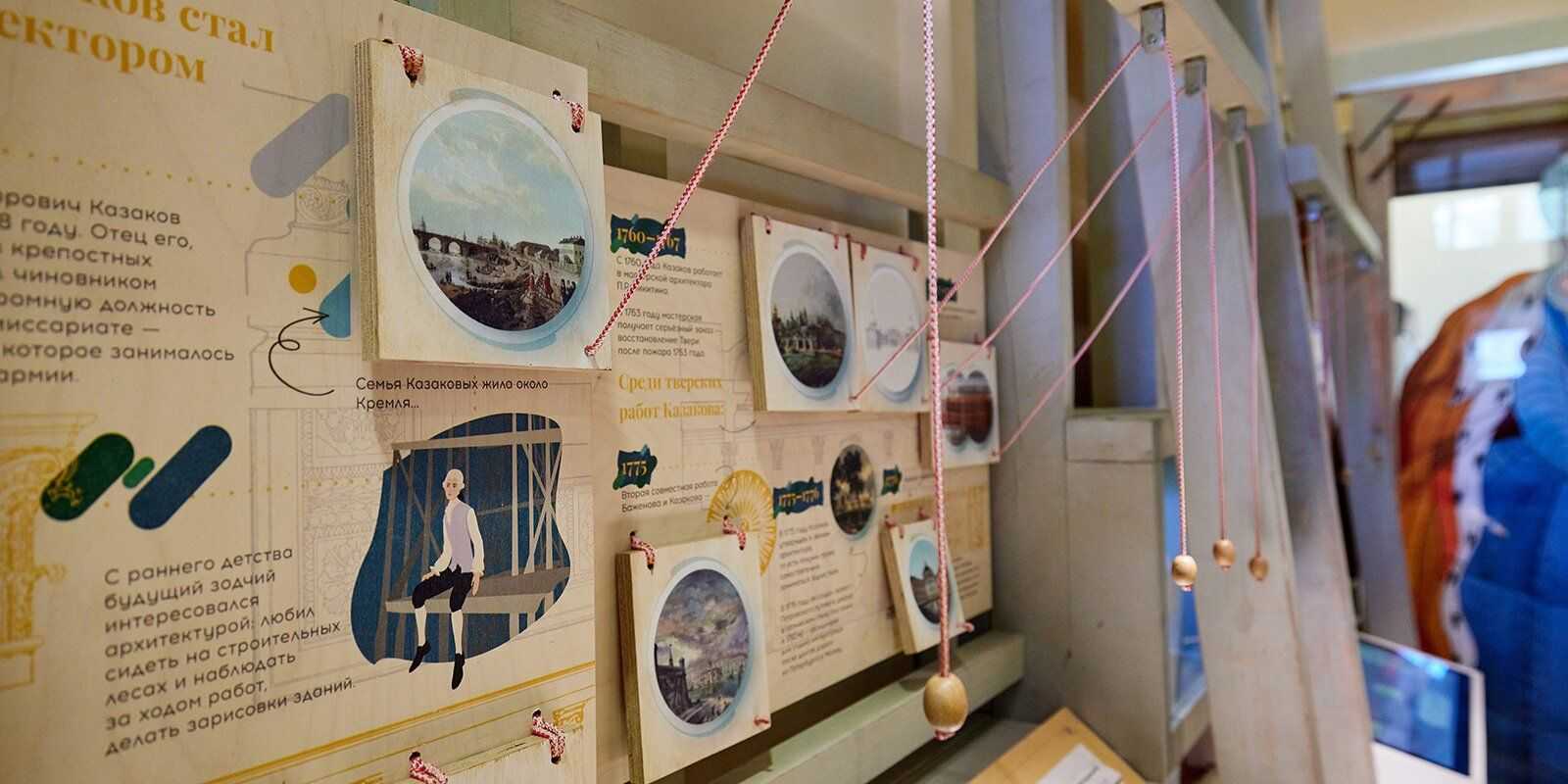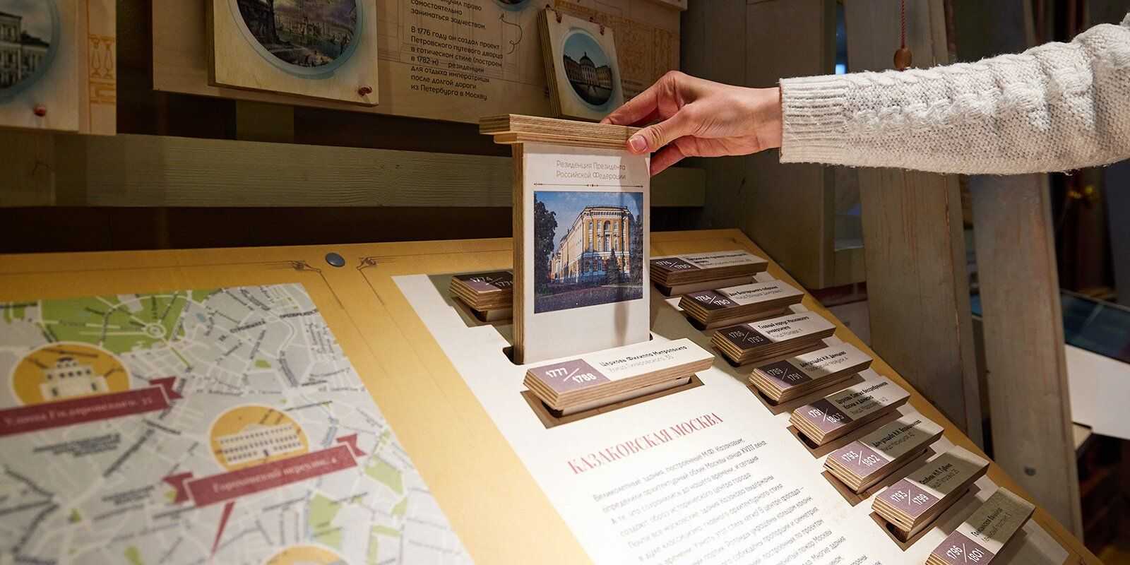 А еще в этом зале можно поиграть в архитекторов. Здесь есть световой стол, на котором изображены главные декоративные элементы фасада дворца. Положив на световой стол лист бумаги, можно скопировать их и создать чертеж здания. Те, кто не хочет рисовать, могут с помощью магнитов дополнить недостающие фрагменты фасада Оперного дома или собрать пазл на сенсорном экране. Для самых любознательных — карта казаковской Москвы с выдвигающимися карточками. Она расскажет, какие еще здания архитектор Матвей Казаков построил в столице.