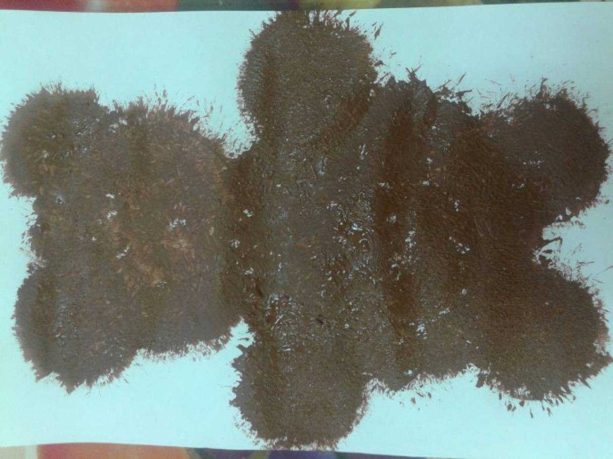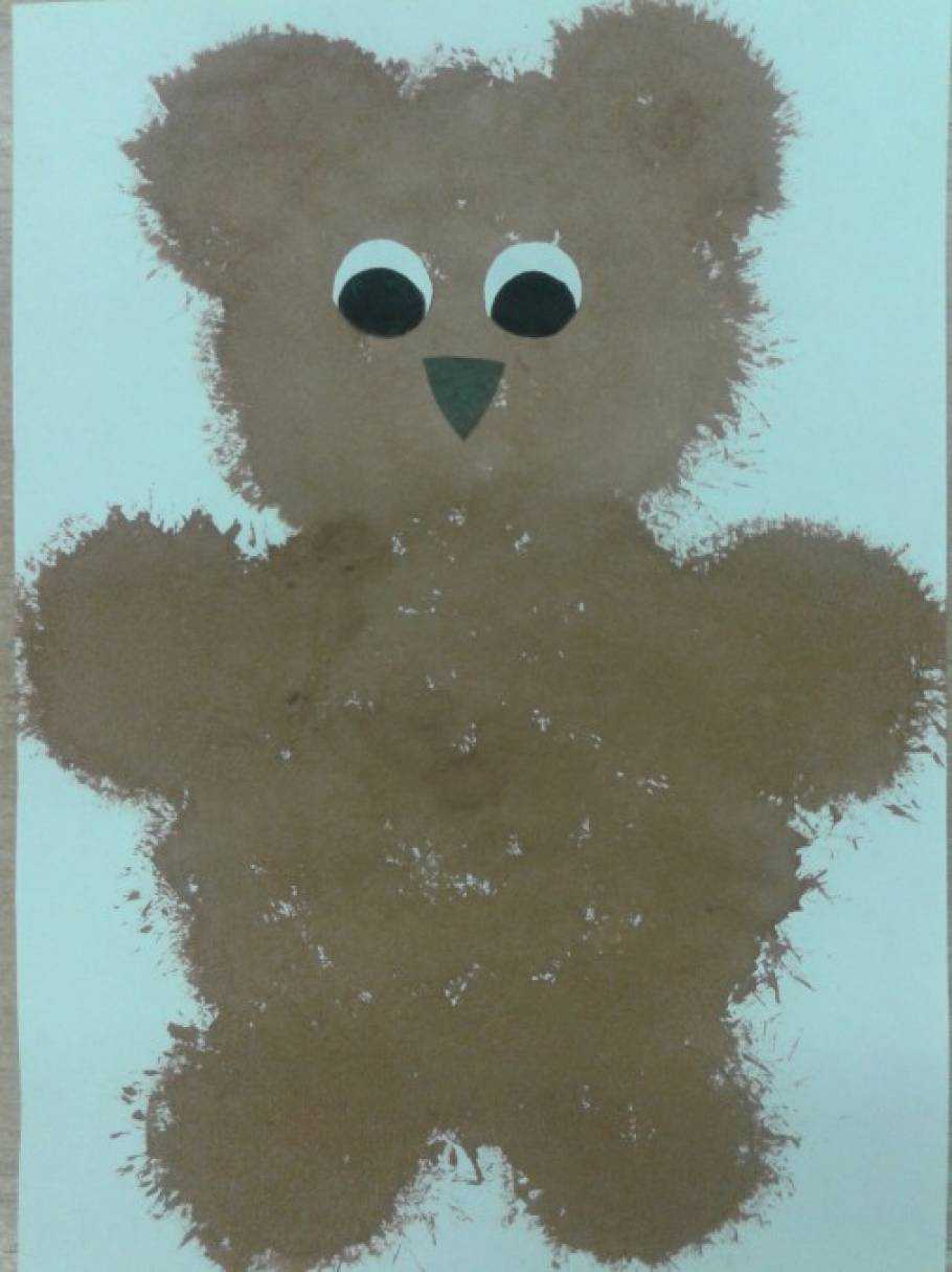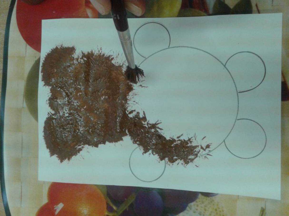 ,опускается в гуашь консистенции густой сметаны и на листке с изображением медведя делаются тычки по контуру,а затем- в середине,заполняя все пространство. Кисточку